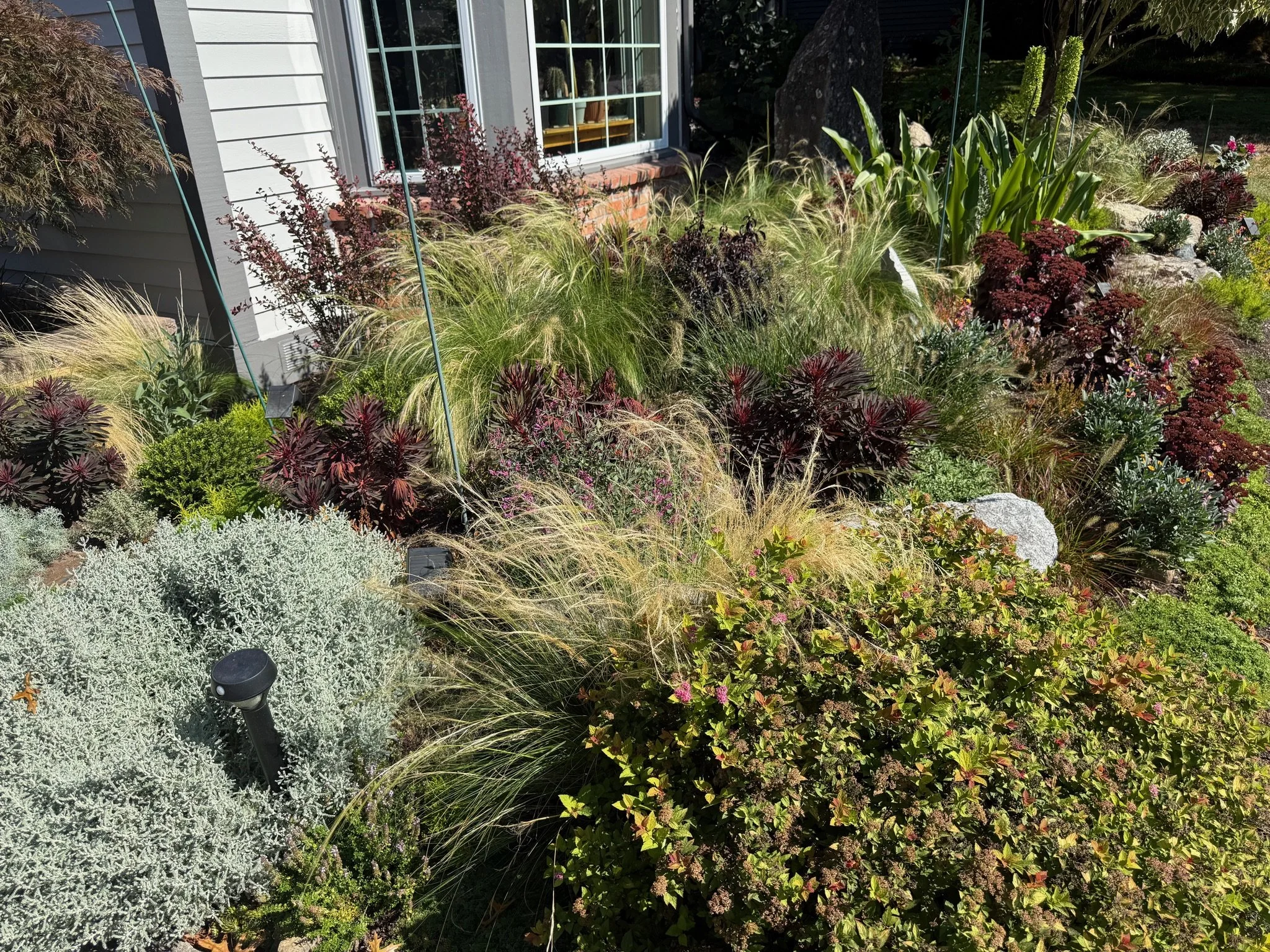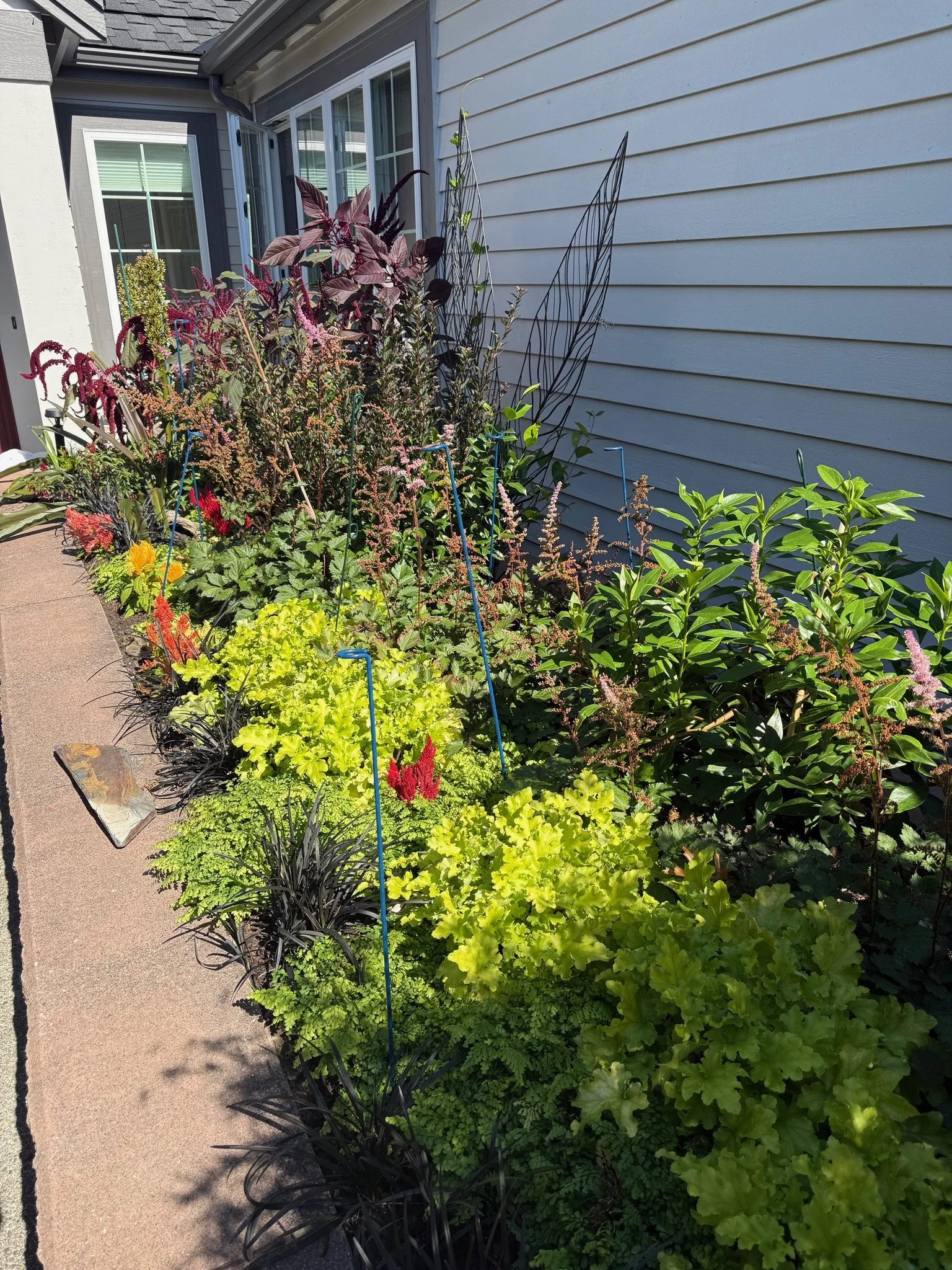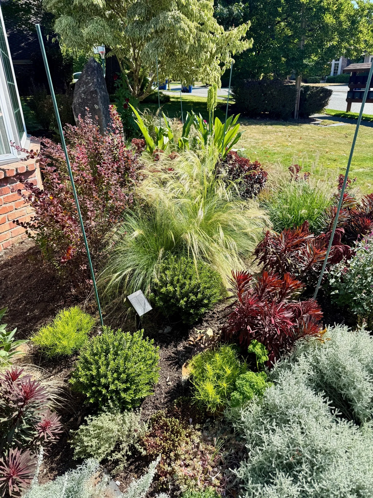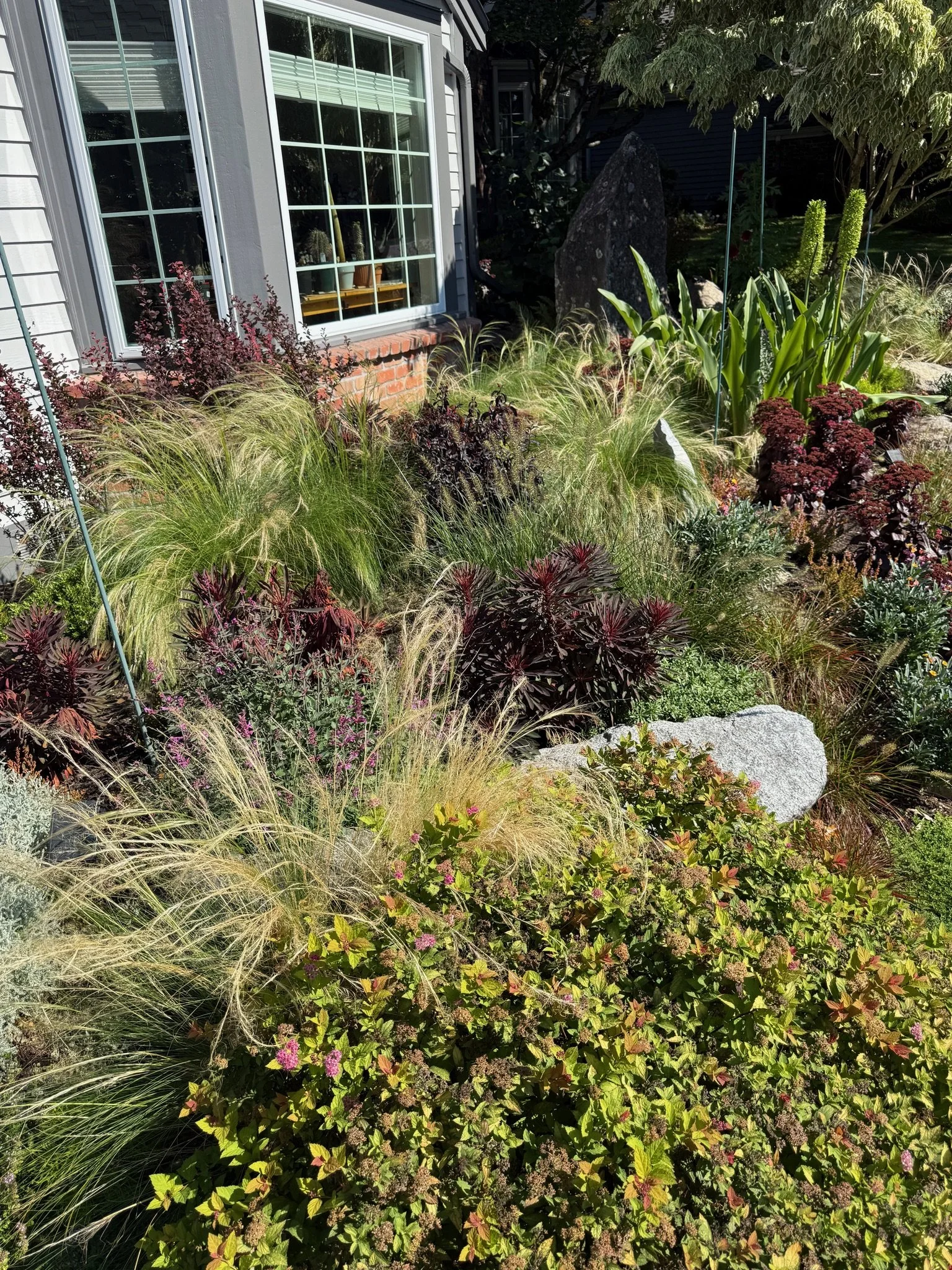 This garden overflowed with beautiful plants but lacked a clear sense of cohesion—something we often see in spaces tended by enthusiastic gardeners. Our clients wanted a more unified design that still felt dynamic and personal, not predictable or dull. By introducing a jewel-toned palette that carries through the seasons, we created rhythm and contrast that break up the wall of green while giving the garden a stronger, more intentional identity.